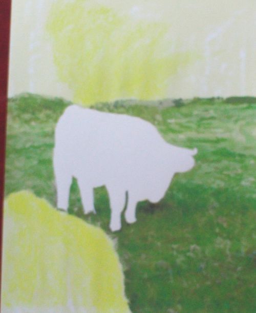 2, I rubbed lemon yellow pastel over the surface of the paper being careful not to go into the bull outline.
