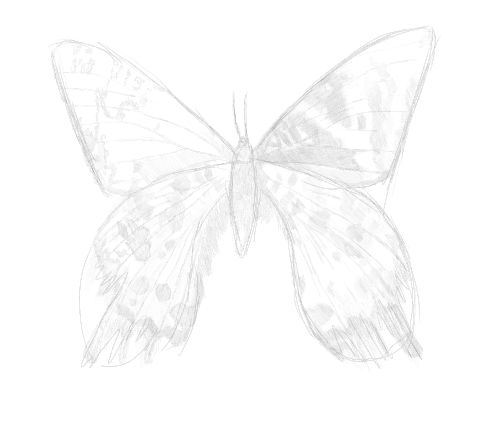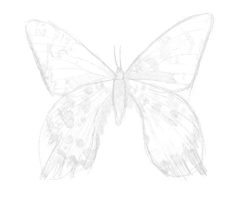7. Now use hatching and dashes to build up tones on the wings. It is important to carefully observe the markings on wings even for a relatively simple butterfly sketch like this.