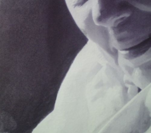 6. I work down the face blending as I go with tissue. Note the broad areas of tone. Really I'm applying tones across each plane of the face. I add highlights to the lower lip with white chalk.