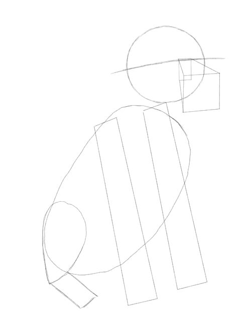 9, This line and rough rectangle will guide your drawing of the other rear leg which the dog has curled underneath its body.