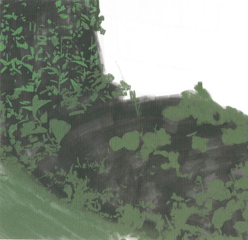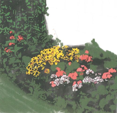 1, An oil sketch. A little black, diluted heavily with turpentine. I am showing the main areas of the foliage and flowers and the edge of the lawn.