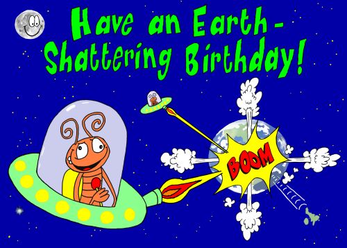 Alien blasting Planet Earth birthday greeting.
