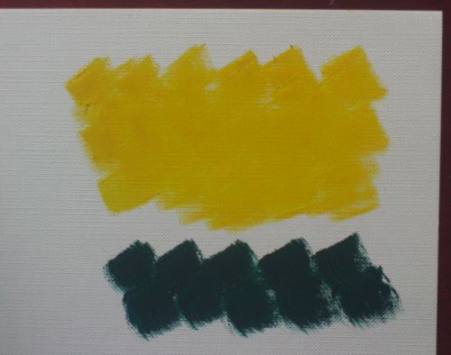1, Use a flat brush, half or one inch. This technique works best with thick paint so use only a little thinner and apply your colour, pale cadmium yellow in this case, on your chosen surface in short strokes. I am using canvas paper, a good, inexpensive paper to practice on.
