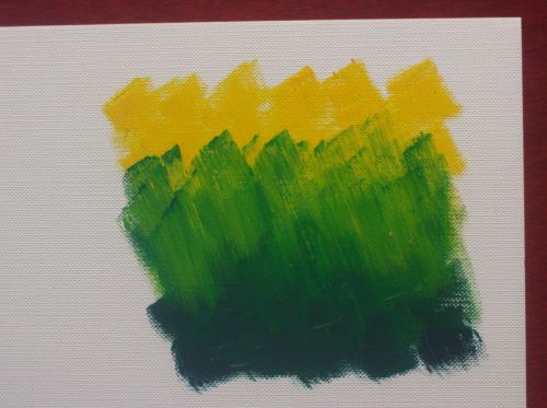 5, Work the yellow into the veridian allowing them to mix gently. See how interesting the paint begins to appear. It catches light where the paint is thickest and the colours are subtly blending without the need to actively melt them together.
