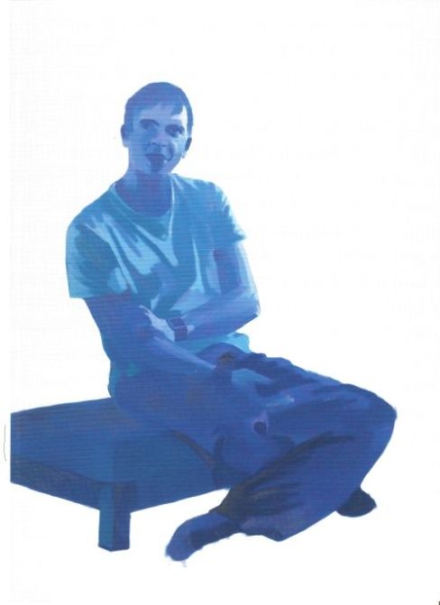 The next stage is where I add earthy colours. I was taught that warm colours shouldn't be laid over cooler ones. I ignore that advice nowadays. I dilute the warmer colours with linseed oil but very little. I add four layers for the skin tones made up fron cadmium red, burnt umber, cadmium yellow and viridian. The shirt is made up of viridian, cadmium yellow and red. Trousers are zinc white, ivory black, cobalt blue and viridian, always working dark to light.